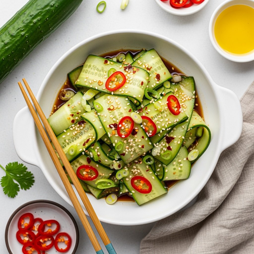 Ingredients: Main Ingredient: For the Sweet & Spicy Dressing: Garnishes: π Quick Instructions: Step 1: Prep the Cucumber Step 2: Make